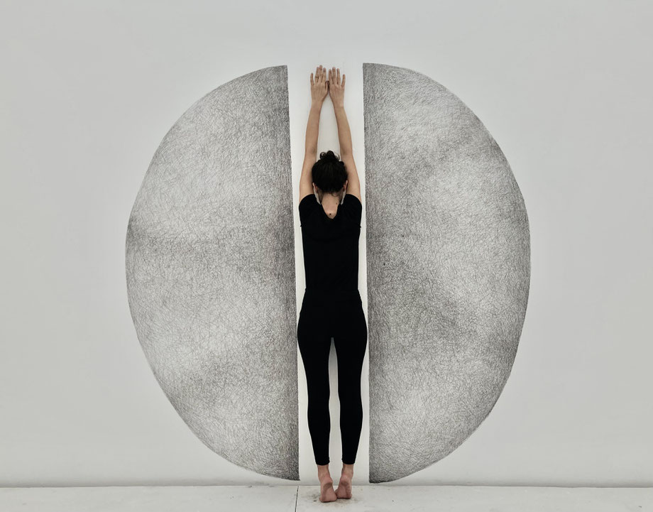 CORLINEA, 2021 präsentiert eine in-situ Graphit-Wandzeichnung aus zwei Hälften, die durch die weiss gehaltene Wandfläche getrennt sind. Sowohl die vertikale Negativfläche als auch die zwei Halbkreise beziehen sich auf das Körpermass der Künstlerin (und der performativen Glasstruktur). Jeder Halbkreis wurde einmal mit der rechten und einmal mit der linken Hand gezeichnet. Die Unperfektion der Zeichnung ist von den koreanischen Moon Jars (Porzelangefässe 1392-1910), die aus zwei Hälften zusammengesetzt werden, inspiriert. Wie unsere Gehirnhälften, steht die eine Hälfte für die Ratio und die andere für das Gefühl.